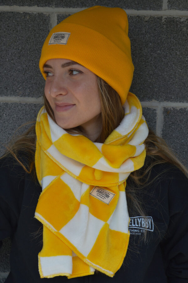 Enroulez-vous dans la douceur et le style! L’écharpe Damier vous accompagne avec chaleur et caractère à chaque sortie!
